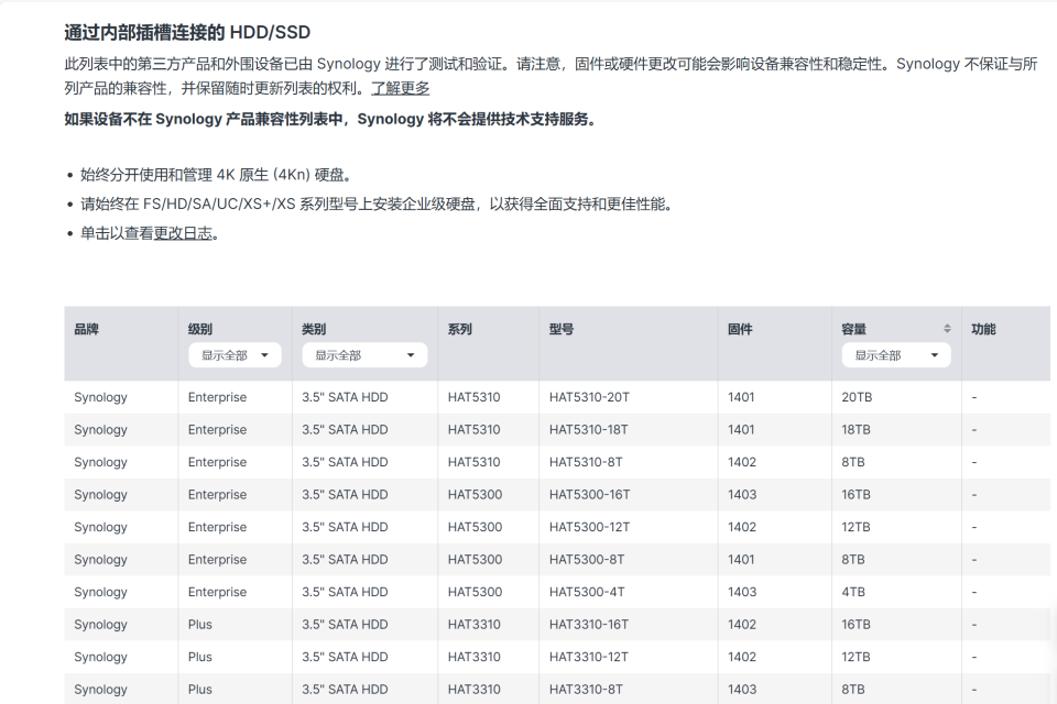 3,兼容硬盘都有群晖自己的认证标准,出现问题的时候也可以大大缩减技术人员排障时间,这也是第三方硬盘所不具备的优势。
