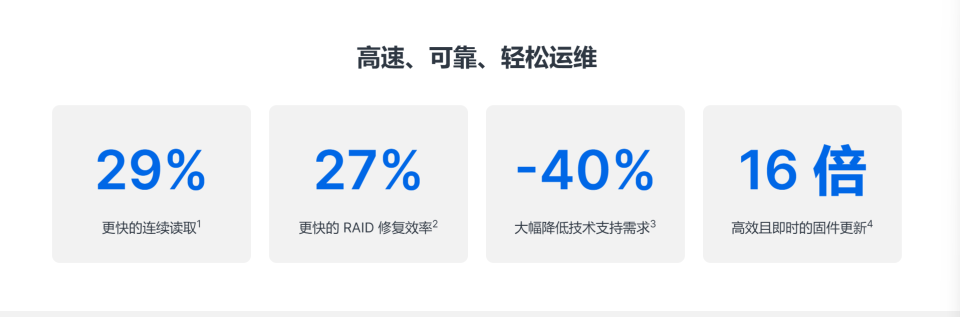 🔺抛开群晖提供的一站式服务不谈,群晖硬盘在性能释放上也是针对DSM系统深度优化。比如说它的固件专为 NAS 工作负载进行智能调优,搭载更高效的 RAID 奇偶校验处理机制,可降低延迟并提升连续吞吐量。在实际应用中,群晖硬盘相比普通第三方硬盘连续读取速度提升 29%,连续写入速度提升 13%,在 RAID 阵列中的硬盘修复速度提升 27%。