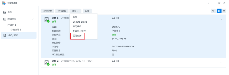 2,群晖兼容硬盘是和自家系统深度适配,所以我们不仅可以在群晖的DSM系统中监控硬盘的健康状况,还能对硬盘进行一键固件升级(目前第三方硬盘升级固件还需要对应厂家提供工具,然后拆下硬盘单独更新,比较麻烦)。