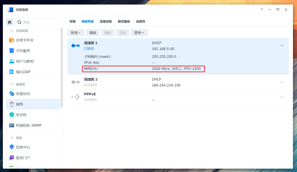 🔺对于25系列新品群晖来说,最明显的改变就是现在接入网络之后,网络状态显示的速率已经变成2500Mb/s(前提是前端路由器或者交换机的网口也是2.5GbE或以上)。