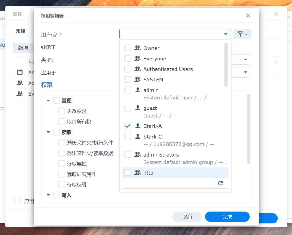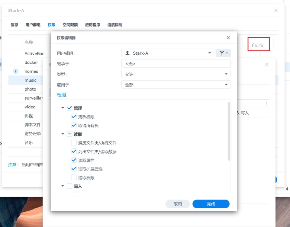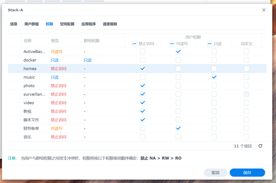 🔺首先群晖NAS支持多级权限设置。我们可以非常轻松的为每个用户、用户组,甚至是文件夹分配不同的访问权限。这一点在我们创建用户或用户组的时候就能看见,它的权限分配具体到每一个文件夹,真正做到了不能动的别动,不能看的别看。
