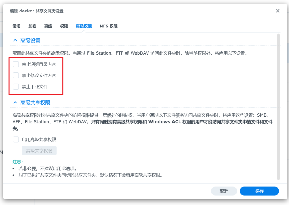 🔺如果你还嫌不够,我们甚至可以对共享文件夹进行相应的权限配置。比如对它进行二次加密保护,或者设置禁止浏览、禁止修改,以及禁止下载。