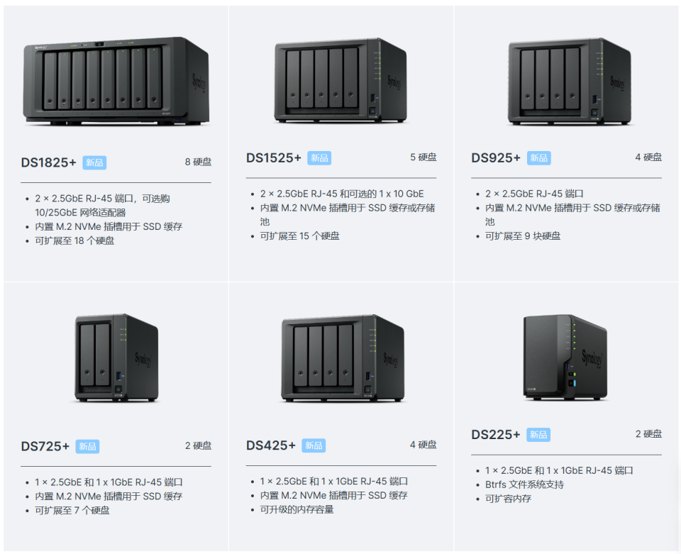1,更新的型号比较多,从入门级的DS225+,到中高端的DS425+、DS725+,DS925+,再到企业级的DS1525+和DS1825+都有。这些型号涵盖了不同的用户需求和应用场景,无论是个人用户、小型工作室还是大型企业,都能在群晖的新品中找到适合自己的产品。