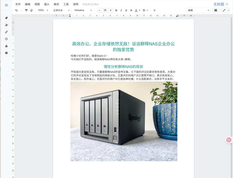 🔺群晖的Office和我们在电脑上使用的办公软件差不多,但是又少了很多冗余功能,用起来非常顺手,我个人还是非常喜欢的。在加上它是完全集成在NAS中,相当于我们免费得到了一个云文档的应用,所以我们可以随时随地,不受限制的在线办公(其实我此时正在摸鱼创作~)。