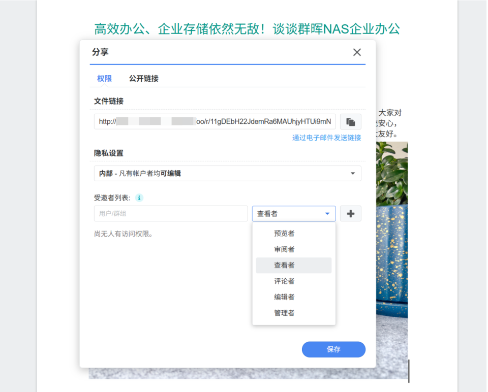 🔺因为它是和Drive整合在一起,所以它还支持多人协作办公。我们仅需将编辑的文章分享给队友,就能让队友也加入进来。当然,群晖的精细化权限在这里也有体现,比如说谁预览,谁审阅,谁查看等等。有的时候就算不是协作,碰到需要客户最后拍板的合同,我也直接通过这种方式分享出去,还是非常便捷的。