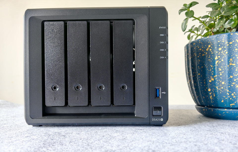 🔺群晖DS425+的正面有四个带锁的硬盘托架,支持3.5英寸SATA HDD或2.5英寸SATA SSD硬盘,最大可以支持80T的存储容量。其它的依然和前代一致,一个主机状态指示灯和四个硬盘状态灯,一个USB 3.2Gen1 接口以及主电源开关按钮。