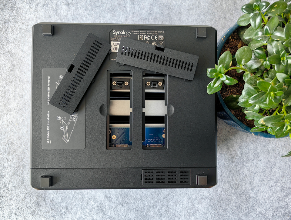 🔺然后是它底部的两个M.2 SSD硬盘槽位,不管是开盖还是安装SSD,都是免螺丝快拆设计,这个还是值得点赞的。群晖DS425+的M.2 SSD除了可以创建SSD缓存,还可以直接用作独立的SSD存储池。