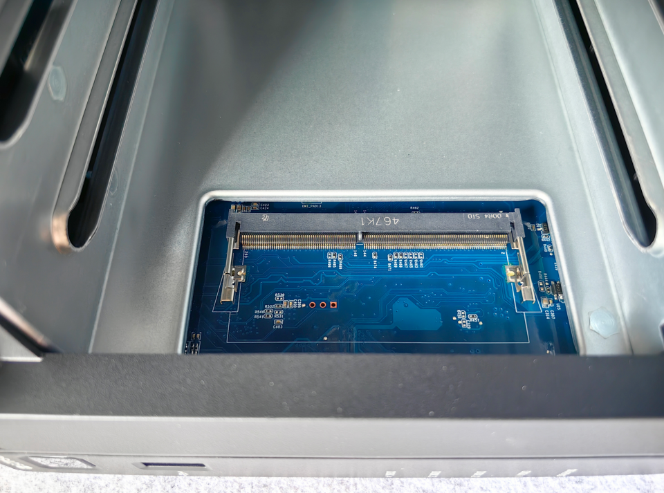🔺最后是内存插槽在设备的硬盘仓内部侧面,板载2GB DDR4内存,还有一个闲置的内存插槽可用于扩展。前面说了,官方给出的说明是可扩展至6GB,实际上可以扩展至18GB,不过前提是需要兼容的内存产品。