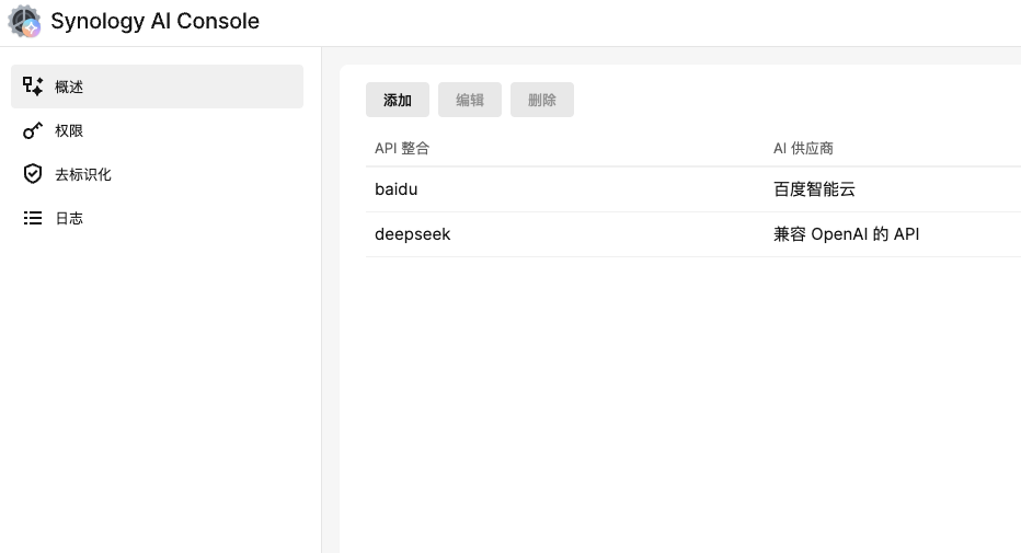 多元模型统一管理:目前 Synology AI Console 支持添加主流国产 AI 模型,比如 DeepSeek、豆包、Kimi、腾讯混元等,并可以通过单一界面高效管理。