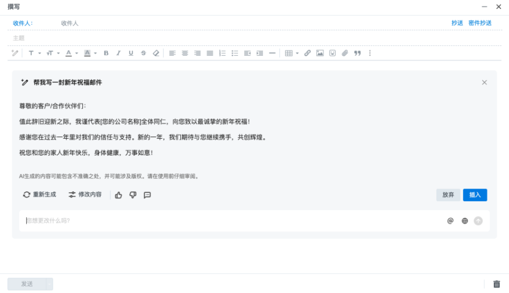 Synology MailPlus 邮件处理效率提升:集成生成式 AI 能力,可总结冗长邮件线程、提供处理建议。支持参考历史邮件或模板生成专业规范的回复内容,一键智能回复,大幅提升邮件处理效率。